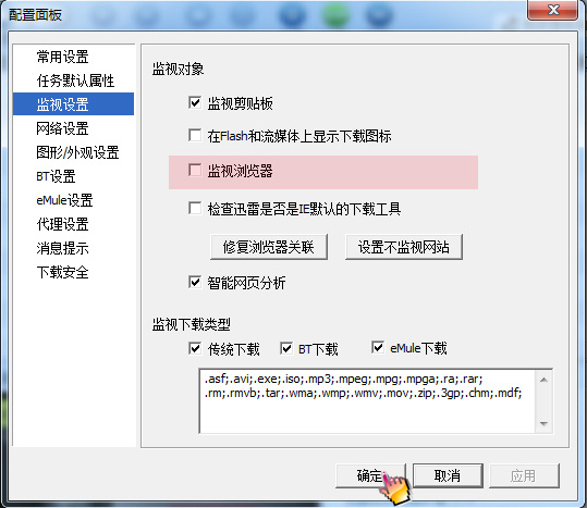 | 下一步:把紅色部分‘監(jiān)視瀏覽器’選項(xiàng)前面的正方形保持未選擇狀態(tài)如下圖,然后點(diǎn)擊最下面的‘確定’按鈕,完全退出迅雷軟件,重新點(diǎn)擊‘保存預(yù)覽圖’按鈕即可完成下載操作。 |