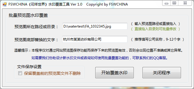 | A:我們網(wǎng)站上每一款花型都有相應(yīng)的預(yù)覽圖(720像素*460像素),會(huì)員瀏覽預(yù)覽圖是免費(fèi)的,但如需把預(yù)覽圖保存到您的電腦上的則需要支付1元購(gòu)物券或電子錢(qián)包金額,保存后的預(yù)覽圖文件尺寸同樣是720像素*460像素,并且是帶有本站水印,效果和網(wǎng)站上瀏覽的是一樣的,預(yù)覽圖保存只是為了方便在本地電腦瀏覽或供離線客戶(hù)挑選花型。 如預(yù)覽圖的水印對(duì)您給客戶(hù)挑選花型時(shí)帶來(lái)不便,可使用我們下面提供的批量水印覆蓋工具來(lái)使用您們特有的水印. |