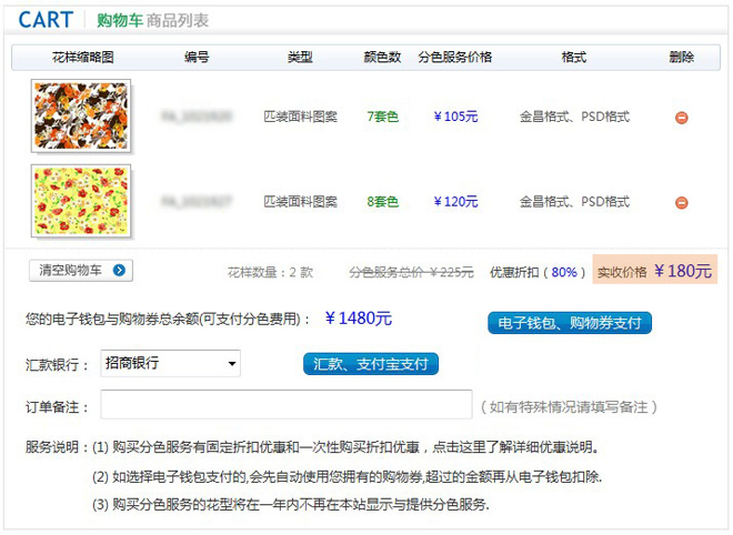 | A:當(dāng)會員挑選好合適的花型,并需要購買該花型的分色稿時,可以將該花型存放于購物車?yán),并通過購物車下購買訂單和進行分色服務(wù)的費用結(jié)算。下面是購物車的使用說明: |