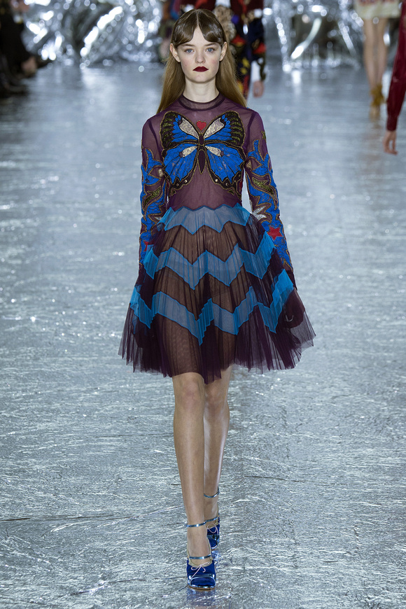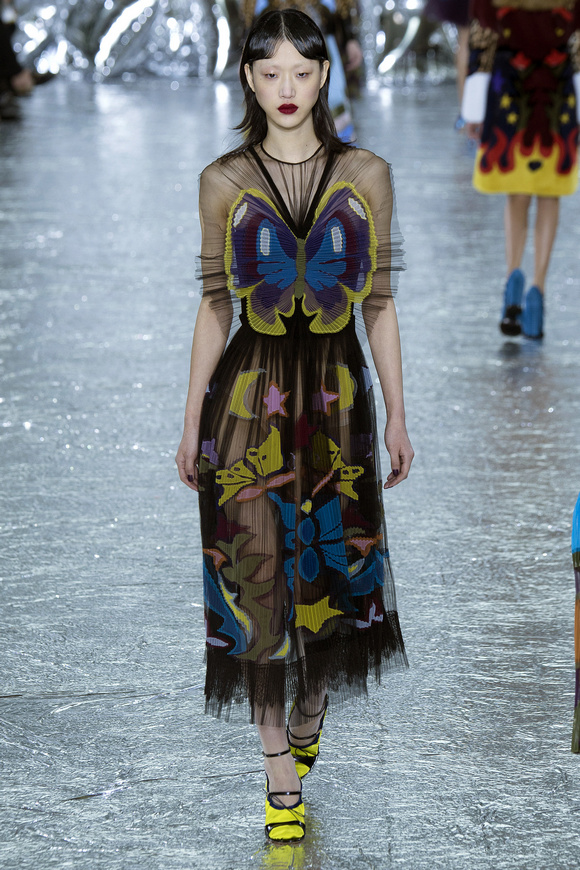 Mary Katrantzou 在她的發(fā)布會(huì)后臺(tái)說(shuō)起她的戀愛(ài),當(dāng)時(shí)她非常樂(lè)衷于把她的第一個(gè)孩子打扮成西部牛仔或者芭蕾舞者。這次秋冬發(fā)布會(huì)的靈感,來(lái)自于她自己的浪漫,對(duì)于美國(guó)50年代西方的風(fēng)格的成謎,一套方方正正的西裝,里面是肩膀帶有裝飾的西部牛仔風(fēng)格的襯衣。Mary Katrantzou用高貴且華麗的迷醉印花表達(dá)著她對(duì)那個(gè)年代的情結(jié)與懷念。在每一件服裝上都能看出設(shè)計(jì)師的巧思與智慧,簡(jiǎn)潔的輪廓與傳統(tǒng)繁復(fù)印花風(fēng)格形成鮮明的對(duì)比,表現(xiàn)出昔日紙醉金迷時(shí)期最迷人的貴族女郎形象。