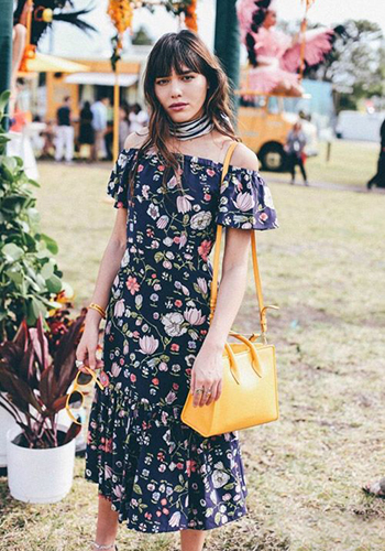 浪漫清新的印花連衣裙,采用時(shí)下最熱的一字領(lǐng)元素,多了不少性感風(fēng)情和女人味,系一條條紋絲巾,多了些復(fù)古韻味。