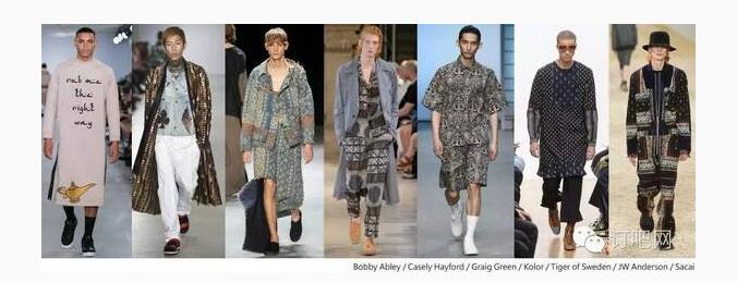 寬松比例與長袍款式,結合奢華又復雜的東方味圖案,為男裝品牌注入獨特的異國風情。設計師利用復雜密集的花紋為柔和大地色男裝增添奢華感,尤其是令人眼花繚亂的小尺寸重復印花。例如 Graig Green 全件絲巾印花布局加上綁帶細節(jié),和 Bobby Abley 中東字體印花的長袍,呈現(xiàn)反差效果;或是 Casely Hayford 緞面印花,帶出一種貴公子氣息。還有 Sacai 中東風情的圖騰印花,Kolor 的手工感 ikat 印染長袍,也都是一時之選。