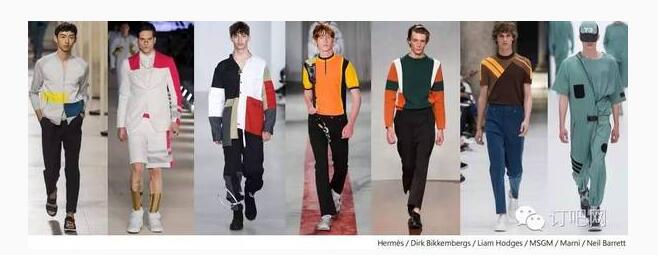 簡約色塊及色條拼接設計,成功吸引年輕的高端奢華市場。例如 MSGM 以明黃色、亮橘色與黑色做拼接; Dirk Bikkembergs 以桃紅與象白色變化西服外觀;Marni 以深綠、焦橘與白色相嵌帶出活力;或是 Y-3 巧妙于同款服裝上運用方塊、圓形、斜條等不同形狀的幾何形。