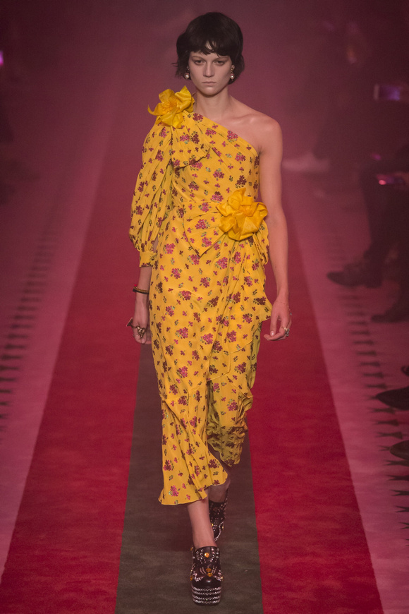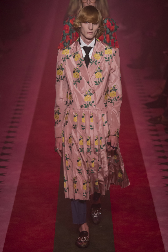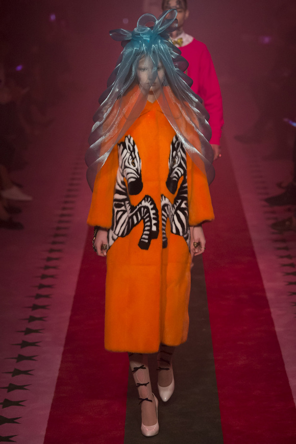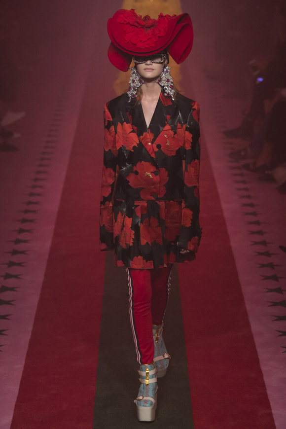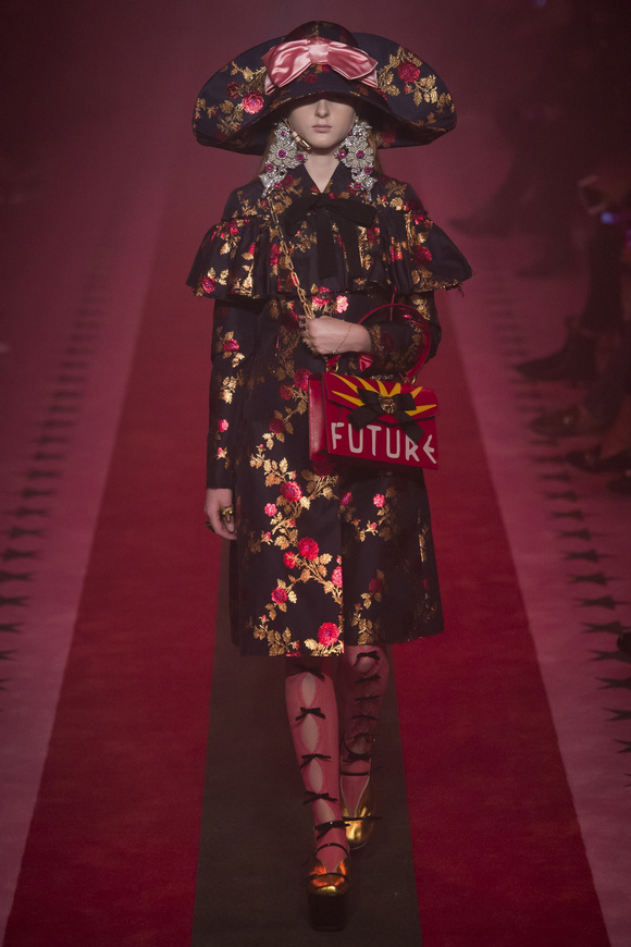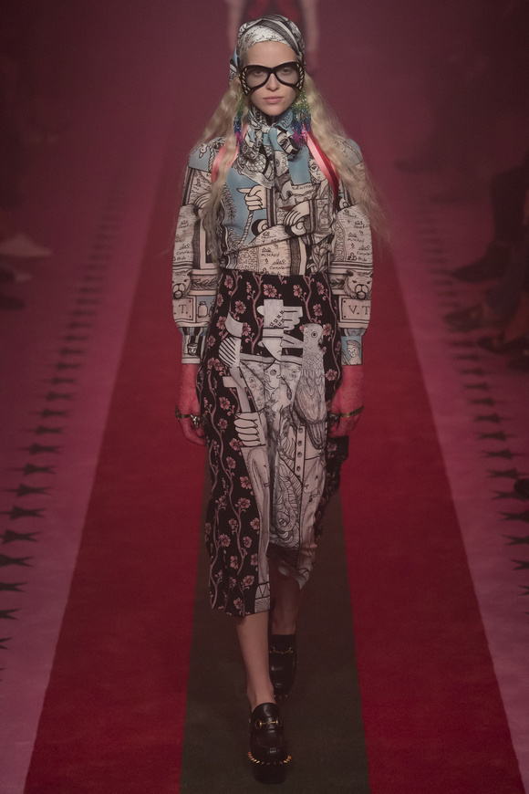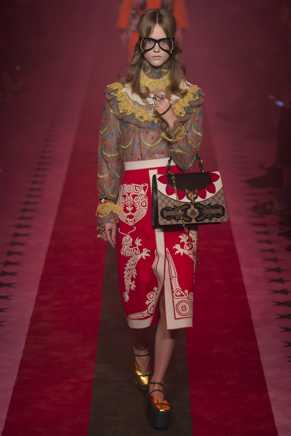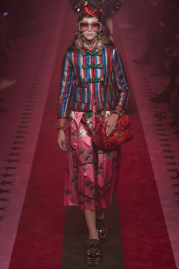 2017 Gucci 的春季發(fā)布會,像在70年代夜總會一樣。服裝充滿刺繡、印花、大墨鏡、尼夾克、閃亮的面料。整場發(fā)布會是對20世紀(jì)流行文化的千變?nèi)f化的應(yīng)用。