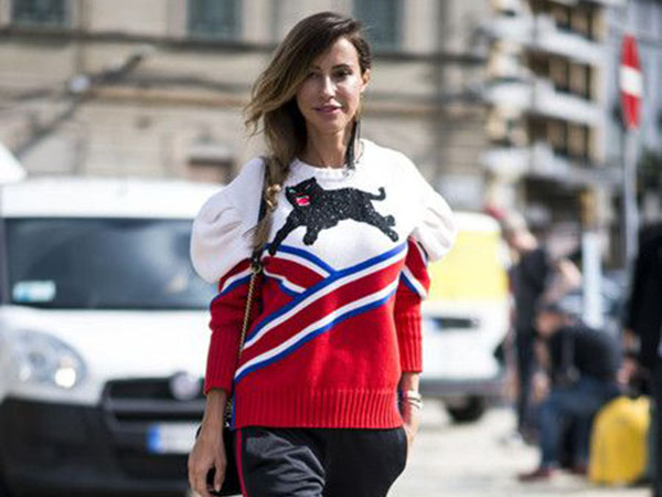 動物圖案印花毛衣,紅白拼色設計,俏皮活潑,穿在身上更顯精氣神,搭配今年側邊條紋運動褲和高跟鞋,輕松穿出完美身材。
