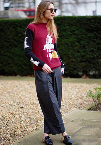 拼色印花毛衣,紅黑顏色,經典不敗,搭配寬松九分褲,踩著今年很流行的毛毛平底鞋,吸晴時髦,讓你溫暖有型。