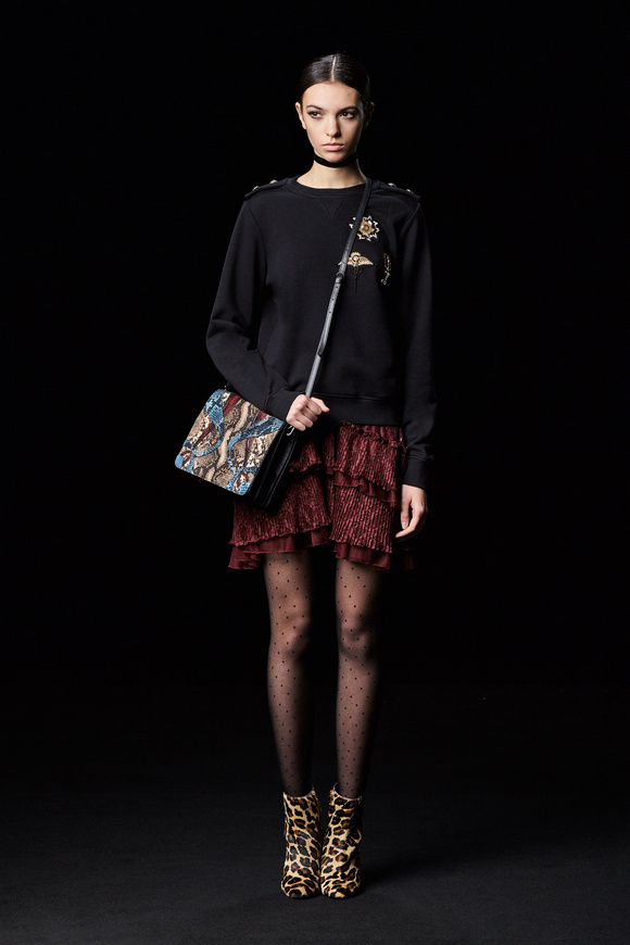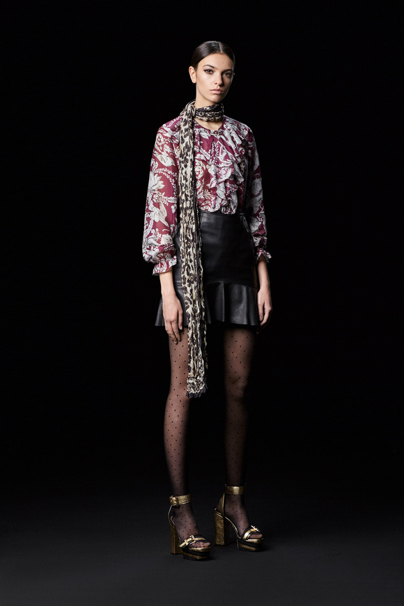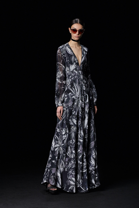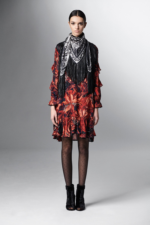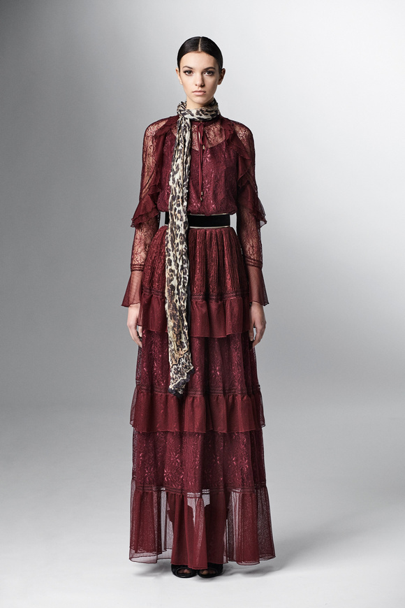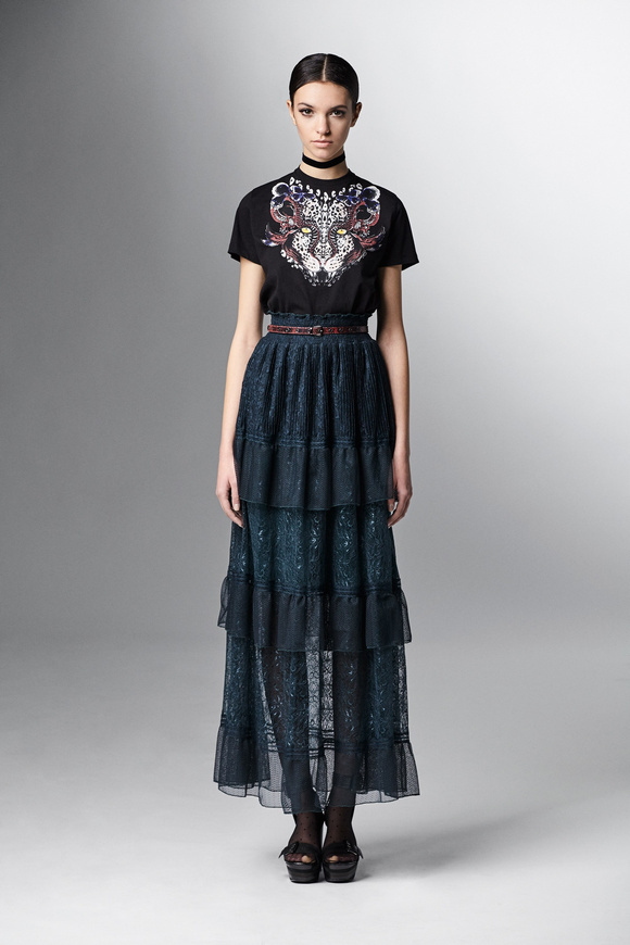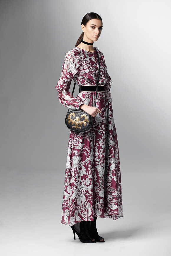 Just Cavalli在這一季的服裝中,大量運(yùn)用了精美的手繪藝術(shù),以及戈布蘭掛毯的復(fù)雜提花花紋圖案,雪紡禮服搭配軍事風(fēng)格的短夾克,或是短斗篷搭配黑色米妮裙,都是令人耳目一新的設(shè)計(jì)。