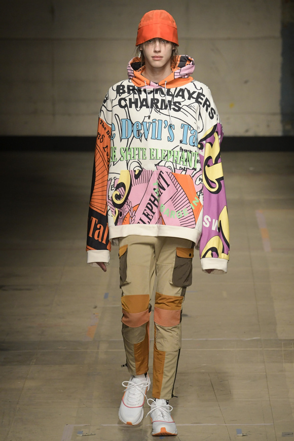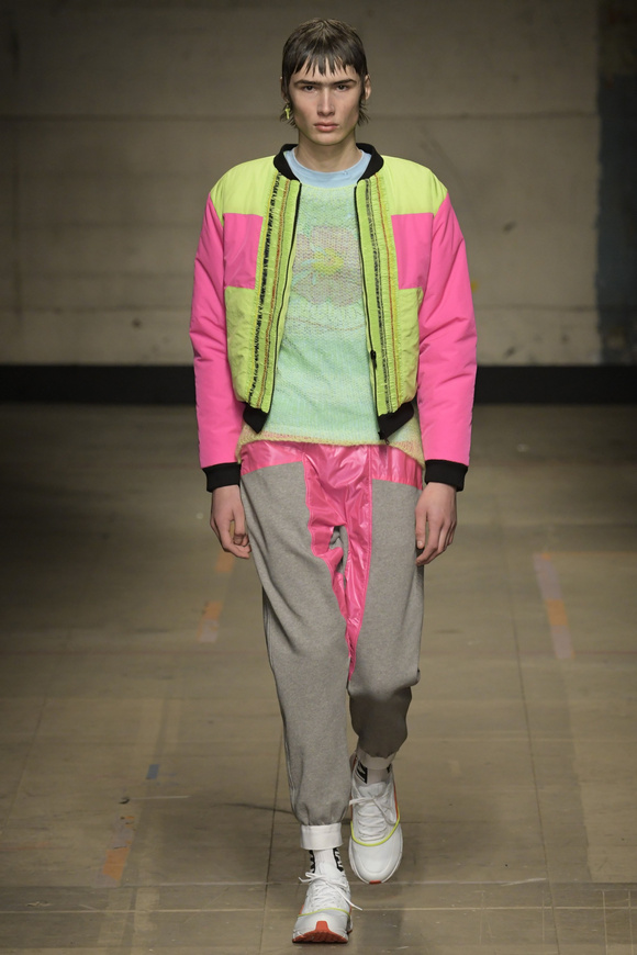 像所有成功的設(shè)計(jì),一些有趣的設(shè)計(jì)后來(lái)卻很難完全被清晰地回憶起來(lái),這一季的男裝運(yùn)用的材料跨度很大,形式也很松散。如詩(shī)人般的花襯衣,來(lái)源于刺青的圖案設(shè)計(jì),污染的灰色的棉軍用夾克。彩色粉筆的長(zhǎng)褲,搭配上運(yùn)動(dòng)鞋,看起來(lái)別有一番英倫風(fēng)味。