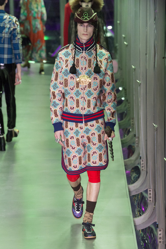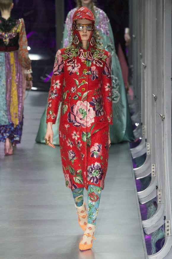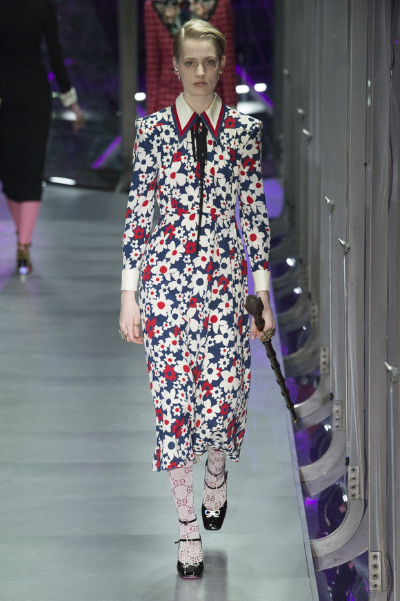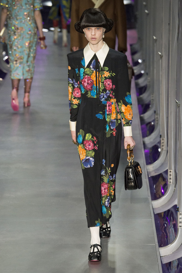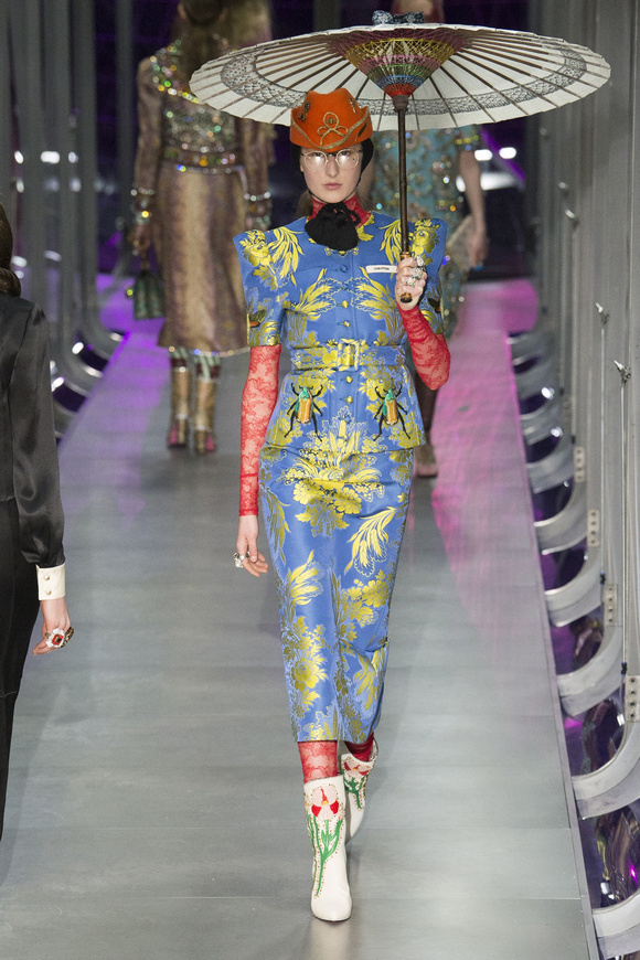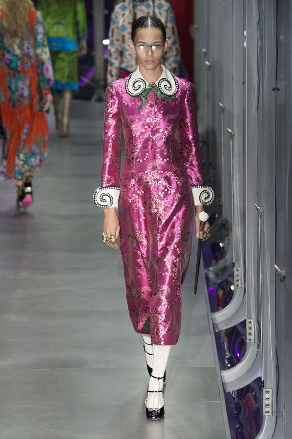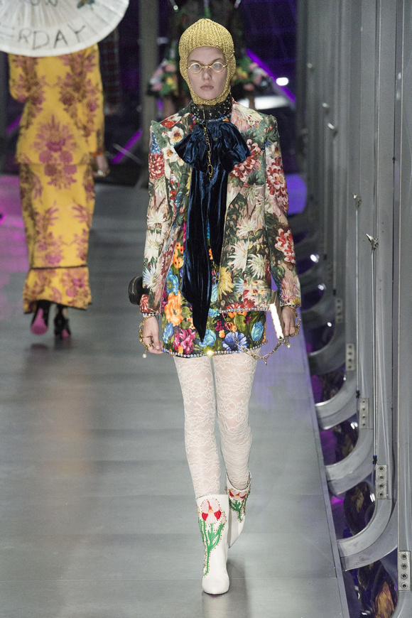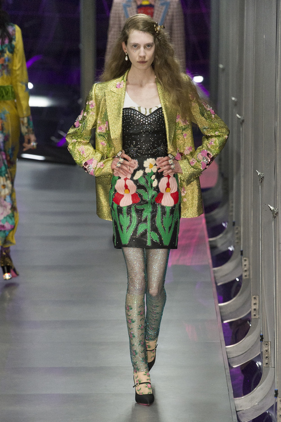 古馳這一季的發(fā)布會(huì)布置成一個(gè)充滿植物和動(dòng)物的秘境,園里棲息著乞靈和召喚古老世界的符號(hào)、標(biāo)記和原型。在這秘境之地,好奇的雙手把玩各種物質(zhì),將其和虛無(wú)縹緲融合為一體,以細(xì)膩與歡愉的直覺(jué)為其鑄型。正如在煉金師的實(shí)驗(yàn)室中,所有物質(zhì)都得被精挑細(xì)選、分離解析,以及處理研究。這個(gè)創(chuàng)作的節(jié)奏總是在經(jīng)歷漫長(zhǎng)的孵化后突然頓悟,整個(gè)過(guò)程就像是奇情幻想威力搶灘了現(xiàn)實(shí)慣性。