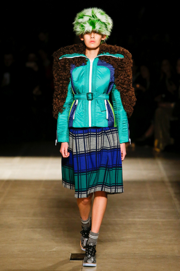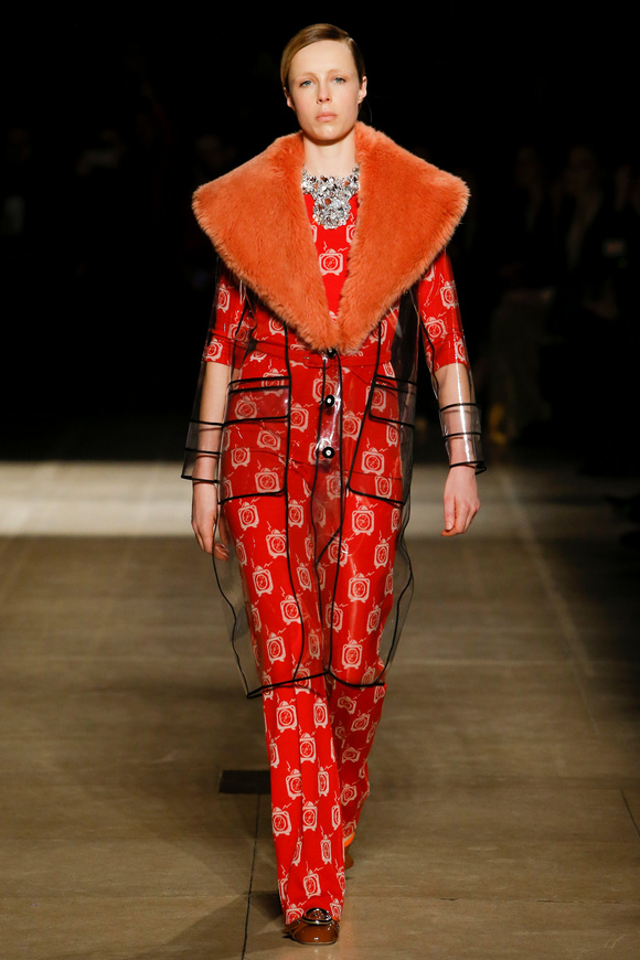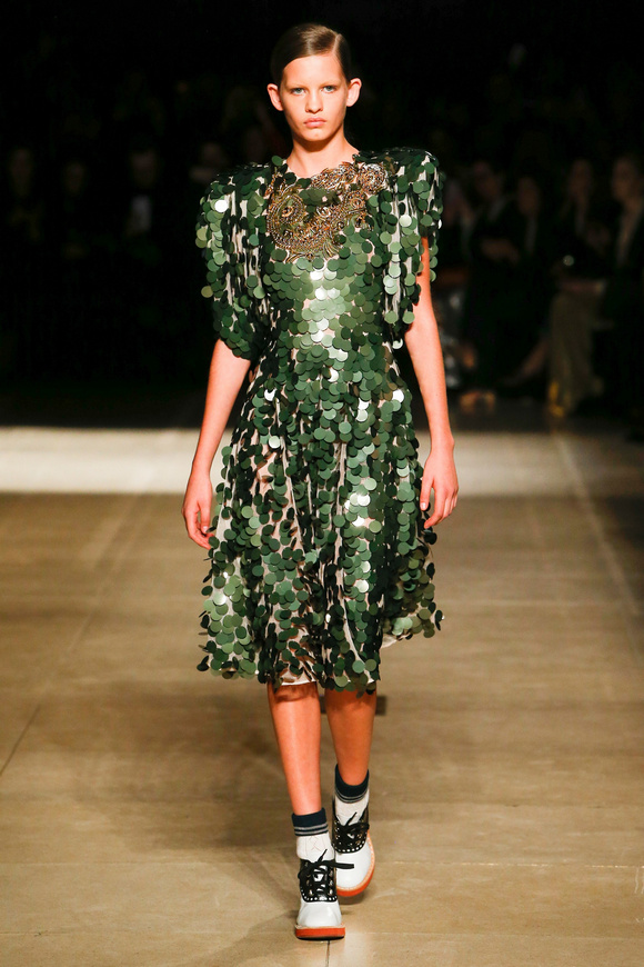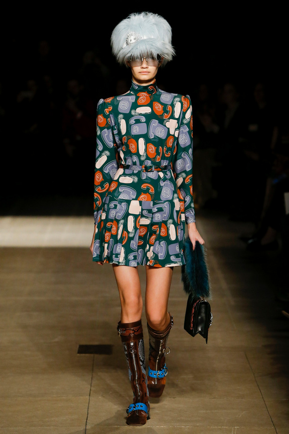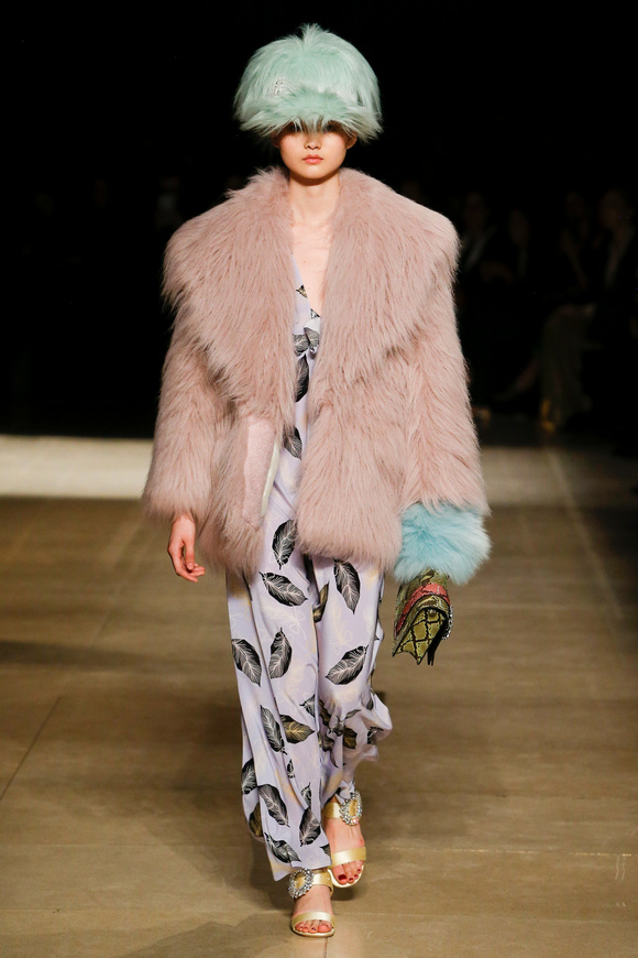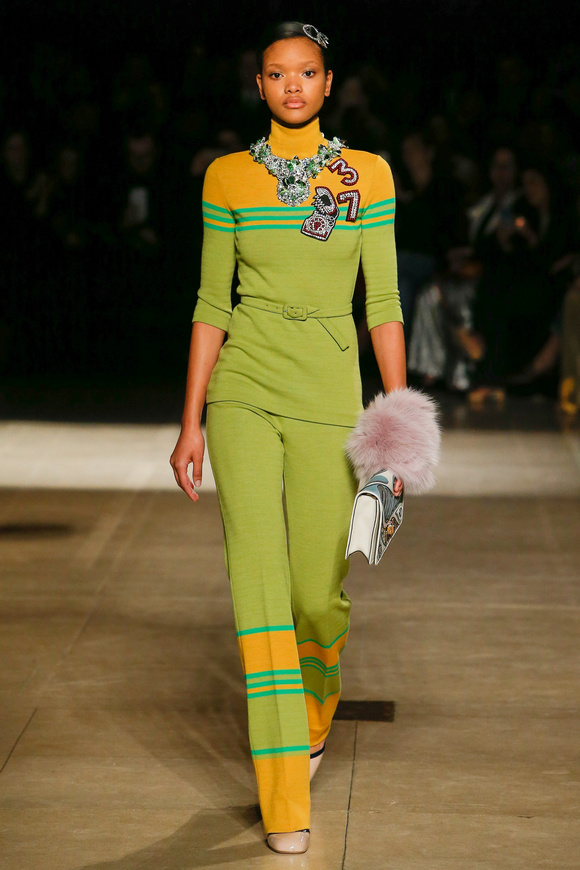 Miu Miu這一季的設(shè)計(jì)有融合各種族的女性和背景。毛茸茸的皮草,束腰外衣和閃亮的人造鉆石和亮片,還點(diǎn)綴這巨大的太陽眼鏡。