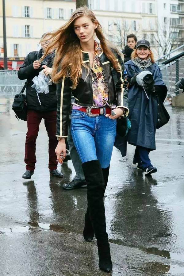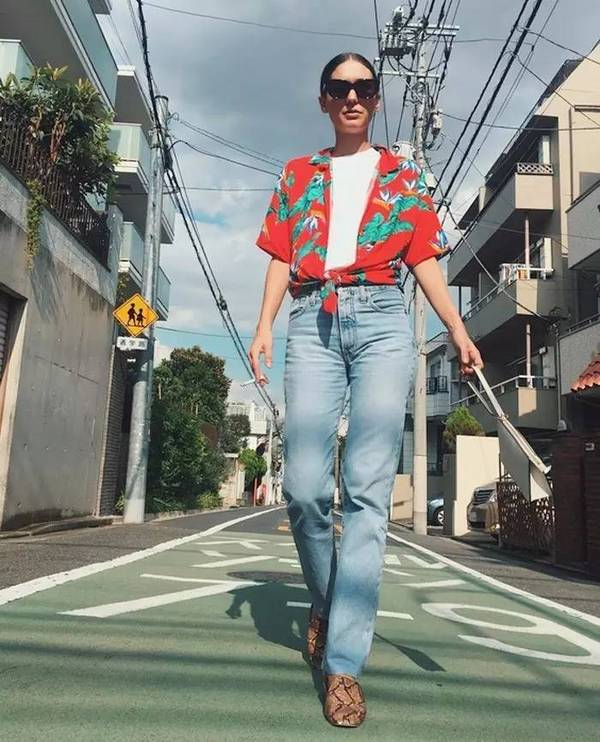 博主Courtney Trop演繹無(wú)袖印花襯衫搭配牛仔夾克