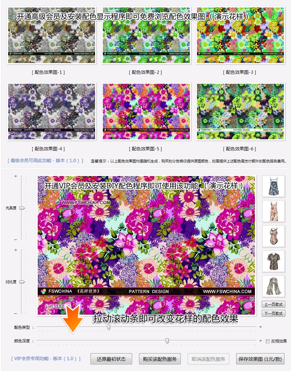 服務(wù)簡(jiǎn)介:《花樣世界》向會(huì)員提供大量精美紡織面料、裁片圖案參考與分色服務(wù),所有印花圖案均能提供分色稿,可直接輸出菲林及高清輸出。 在線客服: