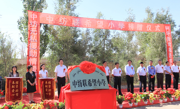 8月9日,“中紡聯(lián)希望小學”揭牌儀式在新疆阿克蘇市柯坪縣阿恰鄉(xiāng)其蘭村小學舉行,中國紡織工業(yè)聯(lián)合會會長王天凱、新疆維吾爾族自治區(qū)政協(xié)副主席王永明等領(lǐng)導為希望小學揭牌,中紡聯(lián)副會長孫瑞哲發(fā)表了熱情洋溢的講話,中紡聯(lián)紀委書記王久新代表聯(lián)合會向柯坪縣捐款。隨同王天凱會長赴新疆調(diào)研的聯(lián)合會、專業(yè)協(xié)會、成員單位領(lǐng)導以及新疆自治區(qū)、地、紡織行辦的領(lǐng)導參加了揭牌儀式,來自二十余家國家紡織產(chǎn)品開發(fā)基地企業(yè)的企業(yè)家們一同參加。